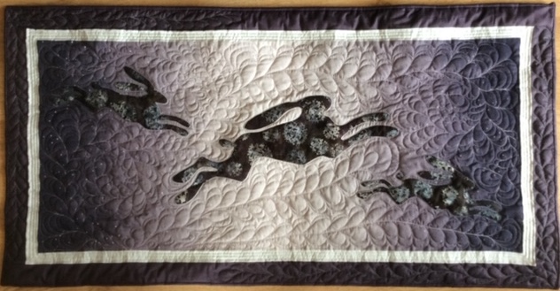 When faced with quilting I sometimes find it hard to decide what to do. Inspiration needs to strike and so it is not unusual for me to have a quilt awaiting completion. One night I was drifting in and out of sleep thinking of the quilt when I suddenly had that spark. Feathers, randomly floating around the hares were what I settled on. Free Motion Quilting takes practice. It’s not something that you can suddenly do and a smaller wall hanging, such as this, is perfect to practice on.
