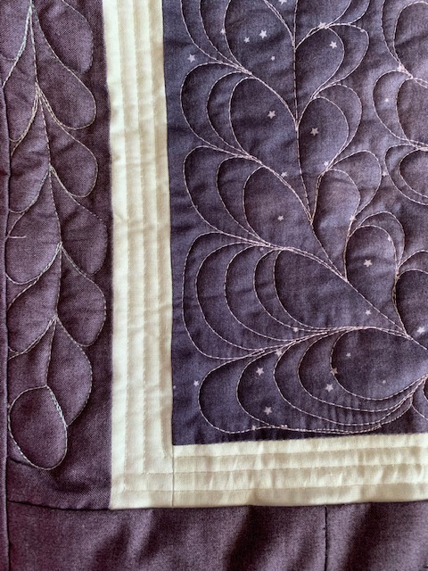 I mentally sectioned the top, filling in the larger areas first and then backfilling with extra feathers and curves. I especially love the way the curled feathers work around in a circle and doing this without drafting was fun. A watchpoint is to work out which way you are going to go so you know where you can stop and which direction to work towards. This helps you not get ‘locked’ in an area without an exit for your needle. I finished this with a contrasting walking foot quilting of lines on the sashing in a silver thread (love a bit of bling), repeating the feathers on the border. I now just need to get it hung on the wall, above the bed. Appropriate, in that sleep was where I found the method to finish it.