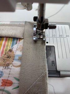 Before trimming the excess check it fits properly. Now is the time to discover mistakes as you can easily unpick the seam quickly and re-sew. Once you are happy, then you can trim the excess, align the raw edges as before and sew the remaining binding gap closed.