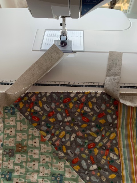 With the quilt pieced/right side up, align the raw edges of the quilt and the binding. You can pin the binding in place if you wish but you may find it easier not to. The binding does ‘shift’ as you sew it in place and try and avoid having a join at a corner, the excess fabric makes it tricky. The foot of your machine will push some excess fabric towards you as you sew.
