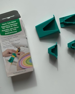 Take the 2 1/2” strip of fabric and the 2 1/2” strip of wadding and layer them together. Wadding on the wrong side of the fabric. The maker is made up of four plastic gadgets which clip together into pairs, a larger pair and a smaller pair. The fabric and wadding strips feed through the gadget which folds as you go to form the tubes. The tube is then fed through your sewing machine and you sew the tube as it forms.