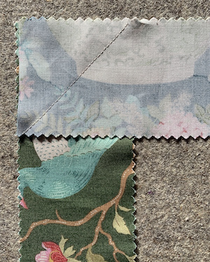 You start by joining all your strips of fabric and wadding together. First, join the strips in the same way as for binding with a angled seam to help spread the seam allowance. You can join the wadding by butting the edges and zig zag across the join. Do not overlap the wadding which would give you a ridge which we don’t want.