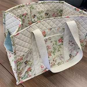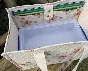 Going back to Cecilia’s Project Bag, this has plenty of pockets to keep all your workshop requirements safe and also takes a plastic box, as shown, to store things in. I particularly like the slip pockets for a cutting mat. These can really be affected by heat in a car so keeping them flat, when the weather gets a bit warm, is really important.