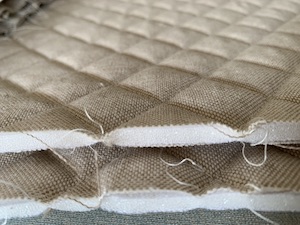 I made a simple squares quilt – 4 1/2” squares, sewed into nine rows of seven squares and finished it with a border of the linear fabric; mitring the corners so the pattern faces inward all the way around. Now came the layering and quilting but what wadding to use?